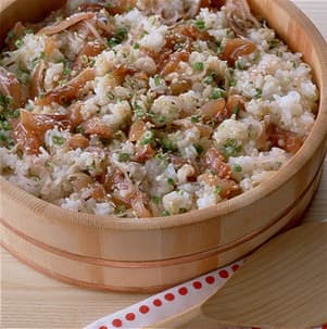 - 7腹骨を除いて皮を引き、幅1cmの斜め切りにしてしょうゆをからめ、すしめし、みょうが、万能ねぎ、ごまと混ぜ合わせる。 時間30分、熱量463kcal、塩分3.2g(1人分)