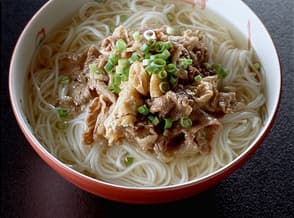 甘辛く煮た油揚げと牛肉をのせた、満足感もたっぷりのそうめん。お酒のシメにも喜ばれそう!