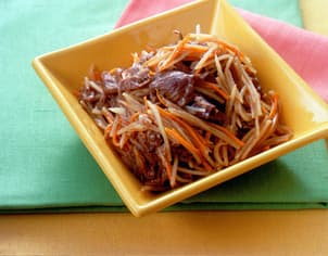 中華鍋を中火で熱してごま油大さじ2を入れてなじませ、牛肉を入れて炒める。肉の色が変わったらじゃがいも、にんじんを順に加えて炒める。じゃがいもが透き通ってきたら合わせ調味料をもう一度混ぜてから加え、手早くからめる。