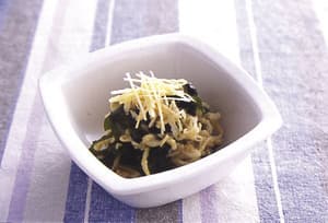 - 2切り干し大根とわかめは水けを絞る。切り干し大根は食べやすく切って、わかめとともにボールに加え、からめる。器に盛り、しょうがのせん切りをのせる。