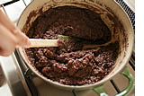 【3】鍋に【2】をあけ、せんそう糖(なければ砂糖)250g、塩少々を加えて弱めの中火にかけ、へらで練りながら煮る。ねっとりとして、つやが出てきたらでき上がり。