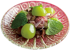 器にローストビーフを盛って、【3】のたれを肉の上に広げ、ぶどうを切り口を下にしてきれいに並べ、ミントの葉を散らす。