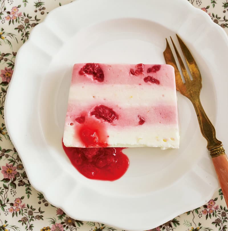ラズベリーソースの材料をすべて小鍋に入れ、中火にかける。耐熱のゴムべらで混ぜながら、かるくとろみがつくまで3分ほど煮る。【3】の型の底を40℃くらいの湯に5秒ほどつけ、ひっくり返して生地を取り出し、食べやすく切る。器に盛り、ラズベリーソース適宜をかける。