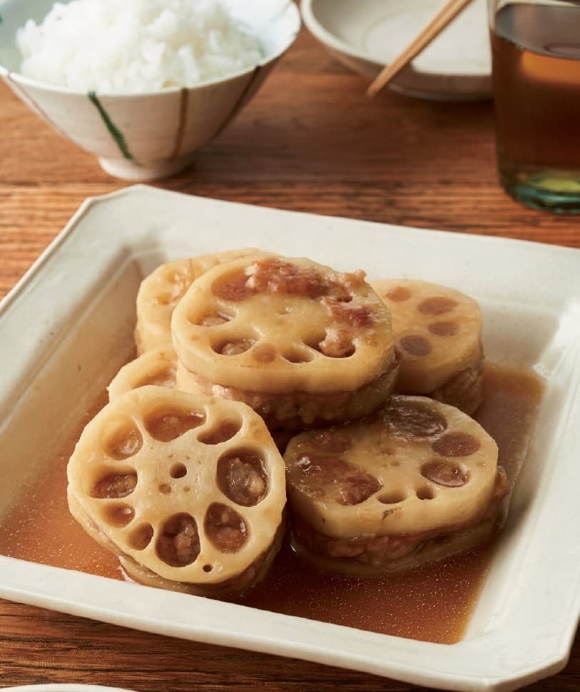 れんこんに片栗粉をまぶすと肉だねがはがれにくく、煮汁にほどよいとろみがついて、味がよくからみます。鶏ひき肉を使えば、よりあっさりとしたやさしい味わいに。