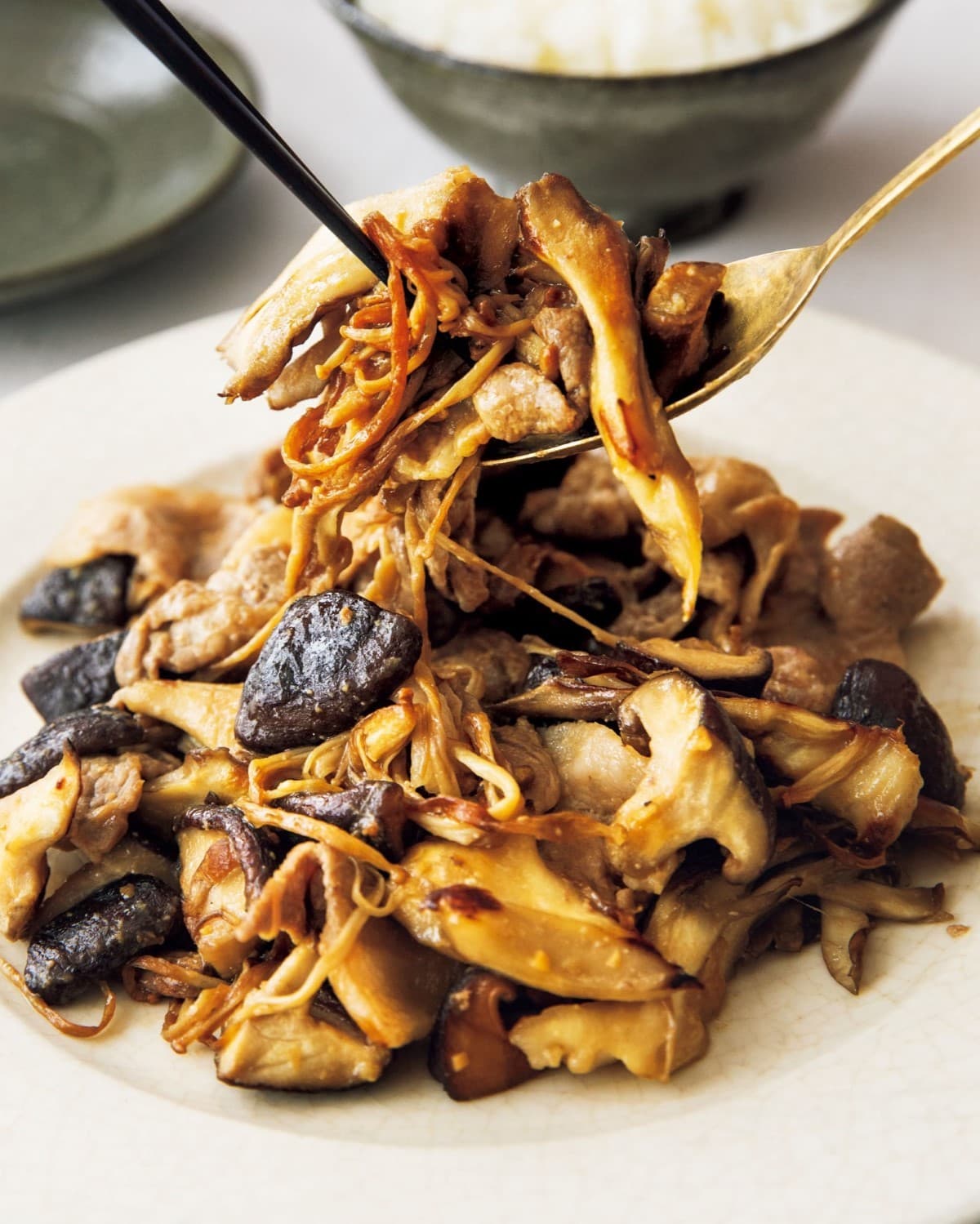 - 3きのこをフライパンの端に寄せ、あいているところにサラダ油小さじ1、豚肉を加えて炒める。肉の色が変わったら、たれを加えて全体をさっと炒め合わせる。 【ポイント】 きのこを炒めてから使うときは、初めに強めの火でじっくり焼きつけてうまみを凝縮させます。香ばしさも格段にアップ!