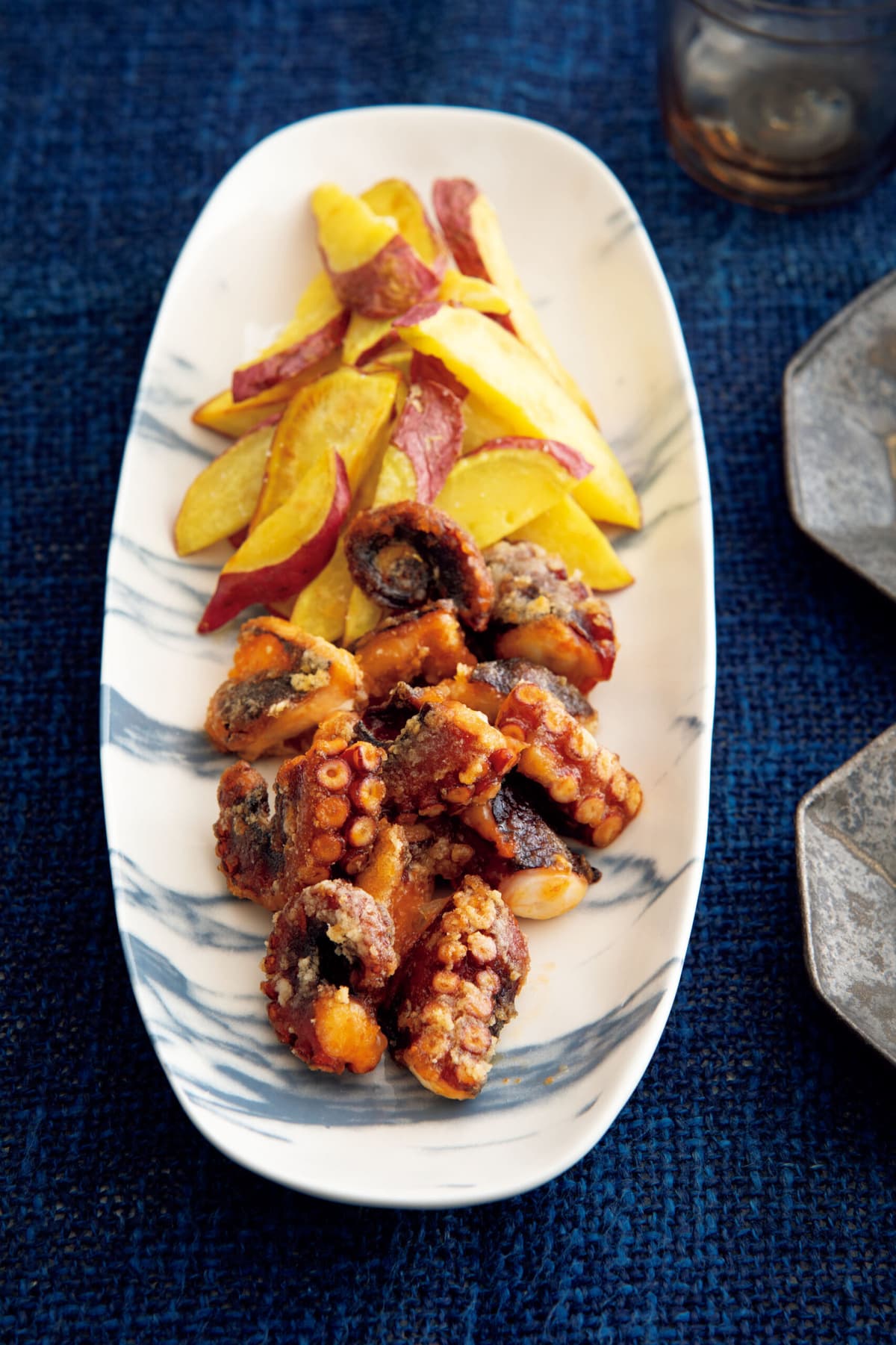 さつまいもはよく洗い、皮つきのまま幅5mmの斜め切りにしてから縦半分に切る。水に5分ほどさらして水けをきり、さらにペーパータオルで水けを拭き取る。たこは一口大に切ってボールに入れ、Aを加えてからめる。バットに片栗粉を広げ入れ、かるく汁けをきったたこを加えて全体にまぶす。